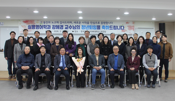 한국열린사이버대 대강당에서 2026년 2월 24일 열린 실용영어학과 강혜경 교수 정년퇴임식에서 교직원들이 기념촬영을 하고 있다. |