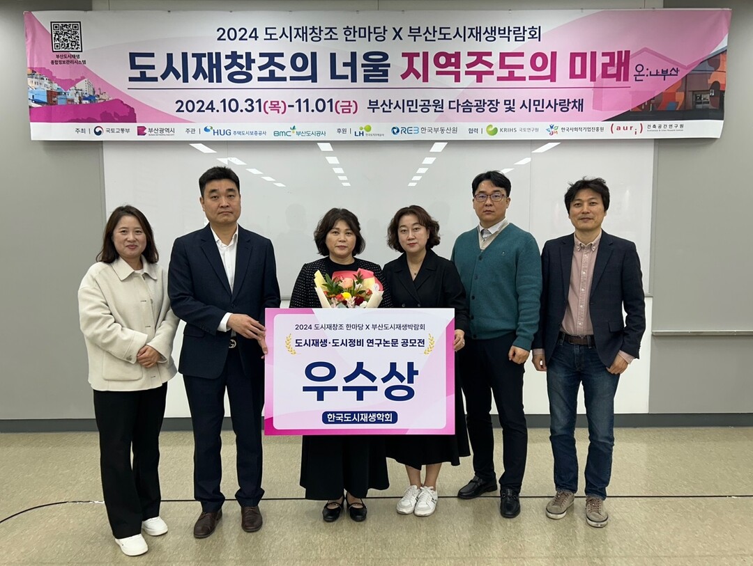 10월 31일 부산시민공원에서 열린 ‘2024 도시재창조 한마당 도시재생·정비 분야 논문 공모전 시상식’에서 우수 논문상을 받은 유미희 씨 등이 기념촬영을 하고 있다. 목원대 제공 |