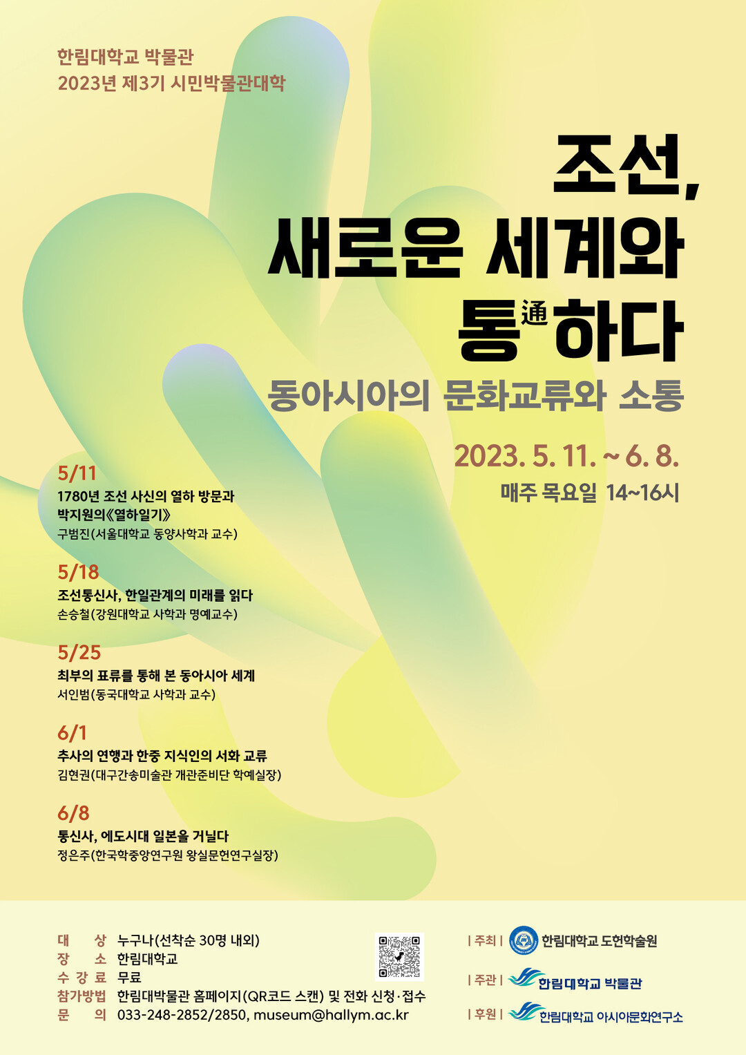 제3기 시민박물관대학은 ‘조선시대 동아시아의 문화교류와 소통’이라는 주제로 11일부터 6월 8일까지 매주 목요일 오후 2시에 5회에 걸쳐 강좌를 진행한다.