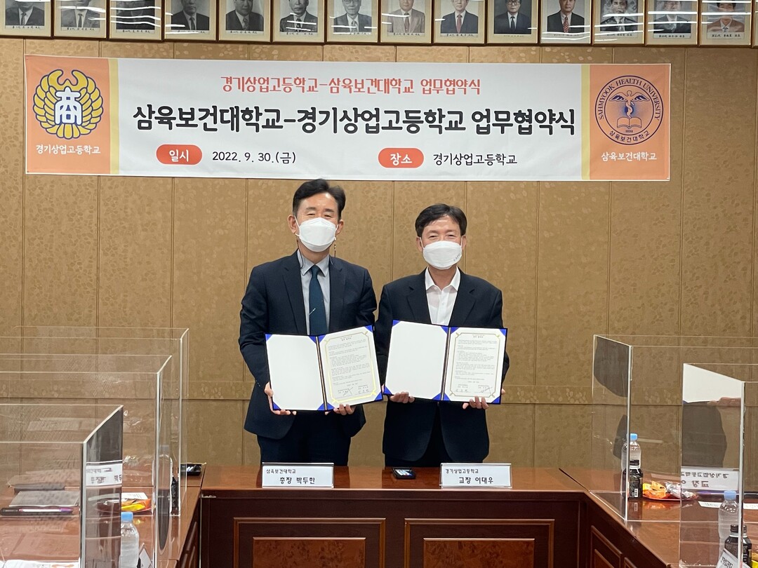 | 박두한(왼쪽) 삼육보건대 총장과 이대우 경기상고 교장이 업무협약을 체결한 뒤 협약서를 펼쳐보이고 있다. 사진=삼육보건대 제공 |