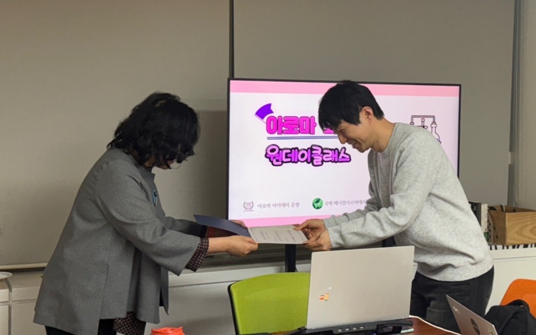 | 사진 : 아로마 화학 원데이 클래스 수업 후 수료증을 교부하는 모습 (제공 = 국제메디컬아로마테라피협회) |