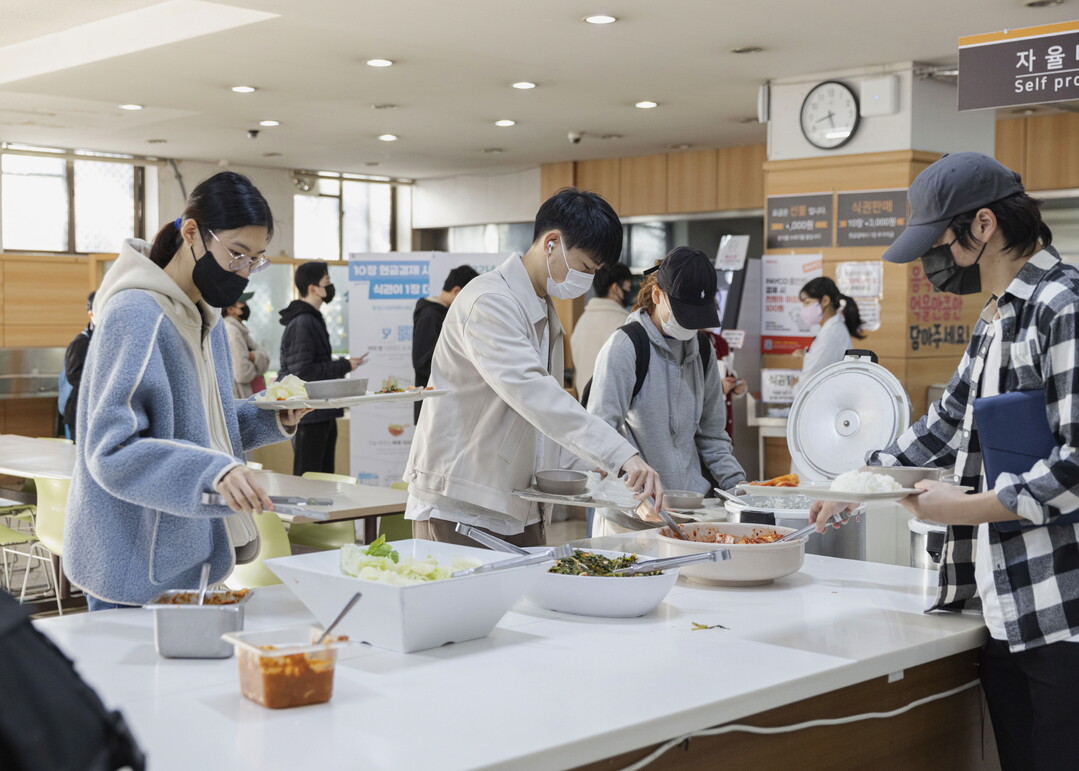고려대 학생들이 3년만에 재개된 한끼를 1000원으로 해결하는 ‘마음든든 아침’ 식사를 하기 위해 식판에 밥과 반찬을 담고 있다. 사진=고려대 제공 |