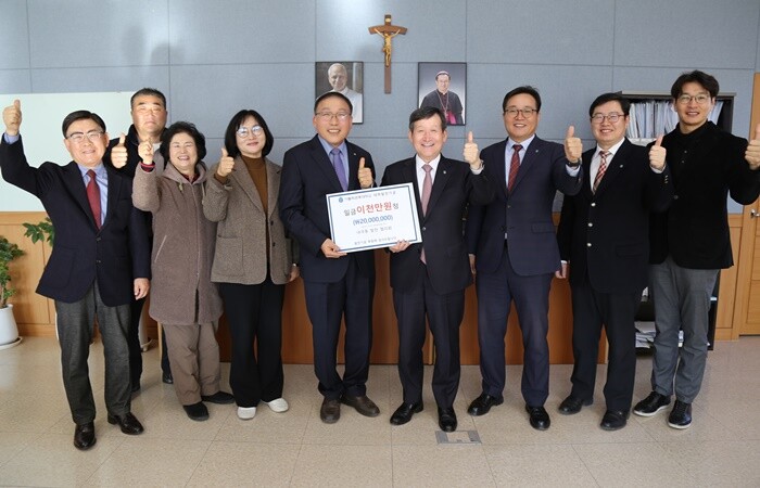 [대학저널 온종림 기자] 가톨릭관동대학교와 지역사회 발전과 대학의 동반 성장을 위해 활동하고 있는 내곡동발전협의회가 대학 발전기금 총 2억 원 기탁 약정을 성실히 이어오고 있으며, 올해 12월 19일 2천만 원을 추가 기탁해 현재까지 누적 1억 2천만 원을 전달했다. 내곡동발전협의회는 2020년부터 2029년까지 매년 2천만 원씩 10년간 발전기금을 기탁하기로 약정하고 꾸준히 실천하고 있다.