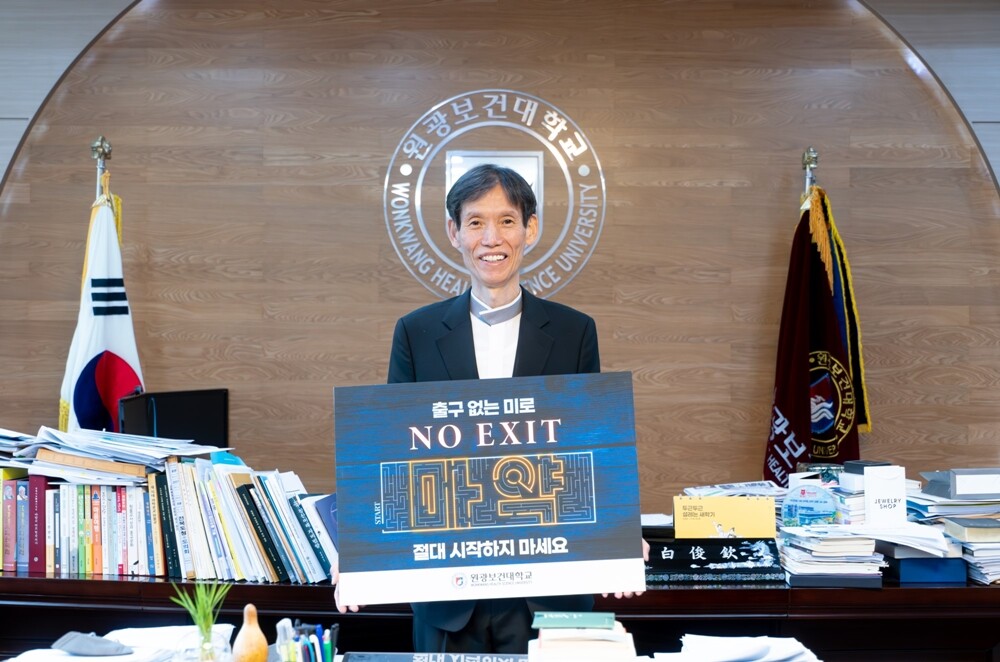 [대학저널 온종림 기자] 백준흠 원광보건대학교 총장이 26일 마약 중독의 위험성을 알리고자 실시하는 ‘노 엑시트(NO EXIT)’ 캠페인에 동참했다.