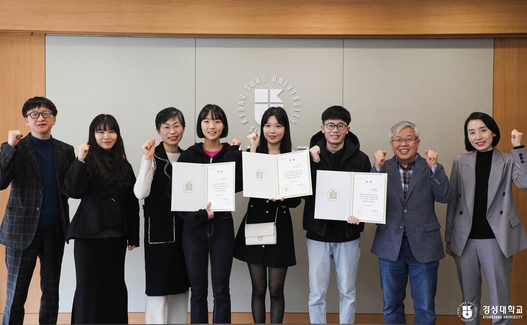 | 경성대 '2022학년도 2학기 학업증진상'을 받은 학생과 지도교수들이 시상식후 파이팅을 외치고 있다. 사진= 경성대 제공. |