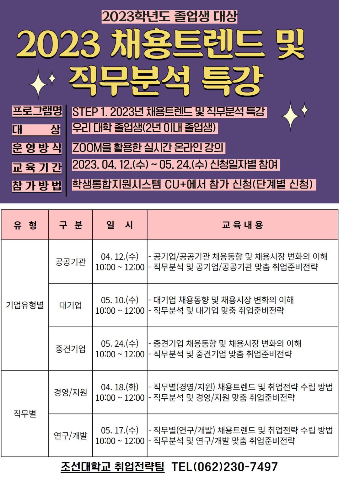 조선대는 대학일자리플러스센터(취업전략팀)가 대학 졸업생들의 취업역량강화와 실전취업지원을 위한 단계별 취업특강을 한다고 3일 밝혔다.