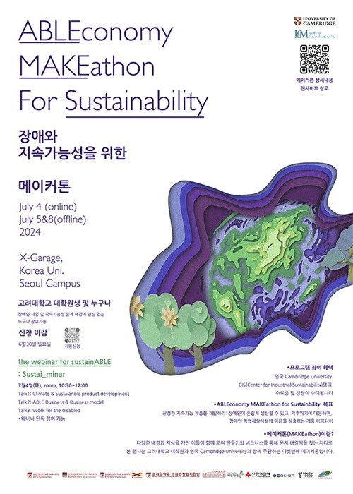 [대학저널 이선용 기자] 고려대학교 BK21 지속가능생활시스템교육연구단은 영국 케임브리지 대학교 산하 Centre for Industrial Sustainability와 함께 7월 4일, 7월 5일, 7월 8일 3일 동안 장애와 지속가능성을 주제로 메이커톤을 개최한다고 26일 밝혔다.