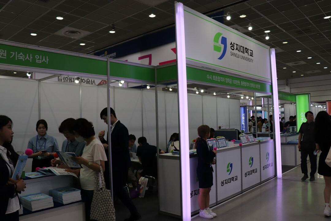 [대학저널 조영훈 기자] 한국대학교육협의회가 주최하는 '2024학년도 수시 입학정보박람회'가 20일 서울 삼성동 코엑스에서 개막됐다. 오는 22일까지 열리는 수시박람회에는 전국 146개 대학이 참가하고 있다. 현재 수험생들이 대학부스에서 입시 상담을 진행하고 있다. 사진은 상지대학교 상담부스 모습.