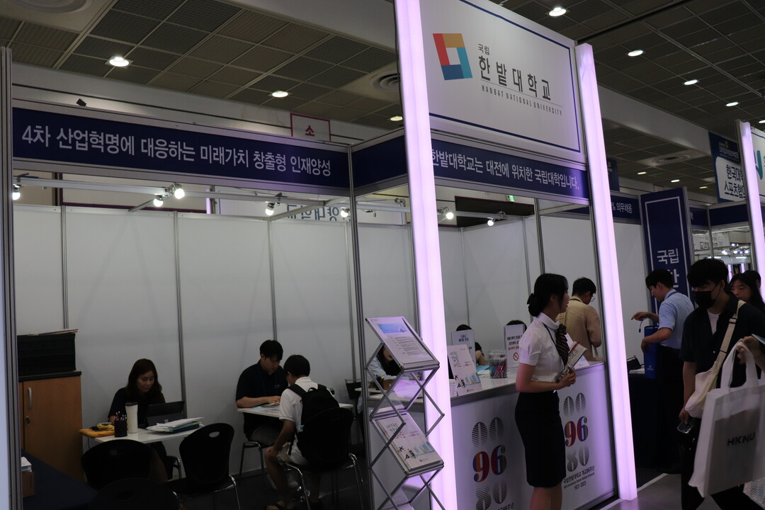 [대학저널 조영훈 기자] 한국대학교육협의회가 주최하는 '2024학년도 수시 입학정보박람회'가 20일 서울 삼성동 코엑스에서 개막됐다. 오는 22일까지 열리는 수시박람회에는 전국 146개 대학이 참가하고 있다. 현재 수험생들이 대학부스에서 입시 상담을 진행하고 있다. 사진은 한밭대 상담부스 모습.