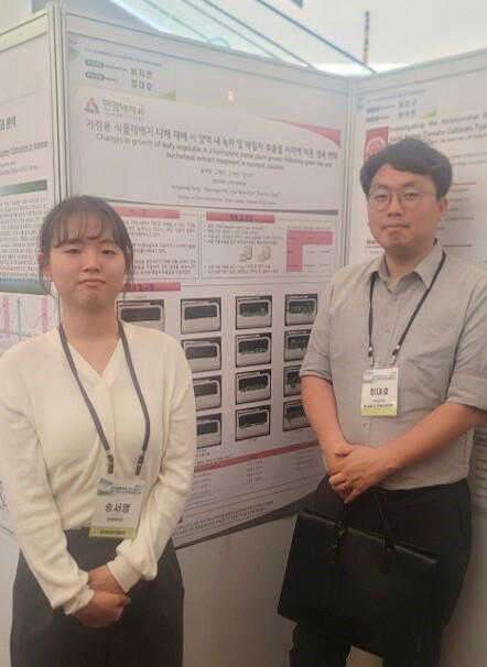 2024년 한국원예학회 정기총회 및 제119차 춘계학술발표회에서 연구 포스터를 발표한 송서영 학생(왼쪽)과 스마트원예학과 학과장 정대호 교수. 사진=연암대 제공 |