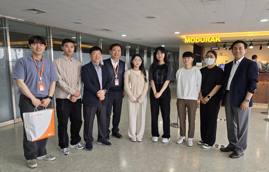 극동대 항공안전관리학과 학생들이 제주항공 본사를 방문해 기념촬영을 하고 있다. 사진=극동대 제공 |
