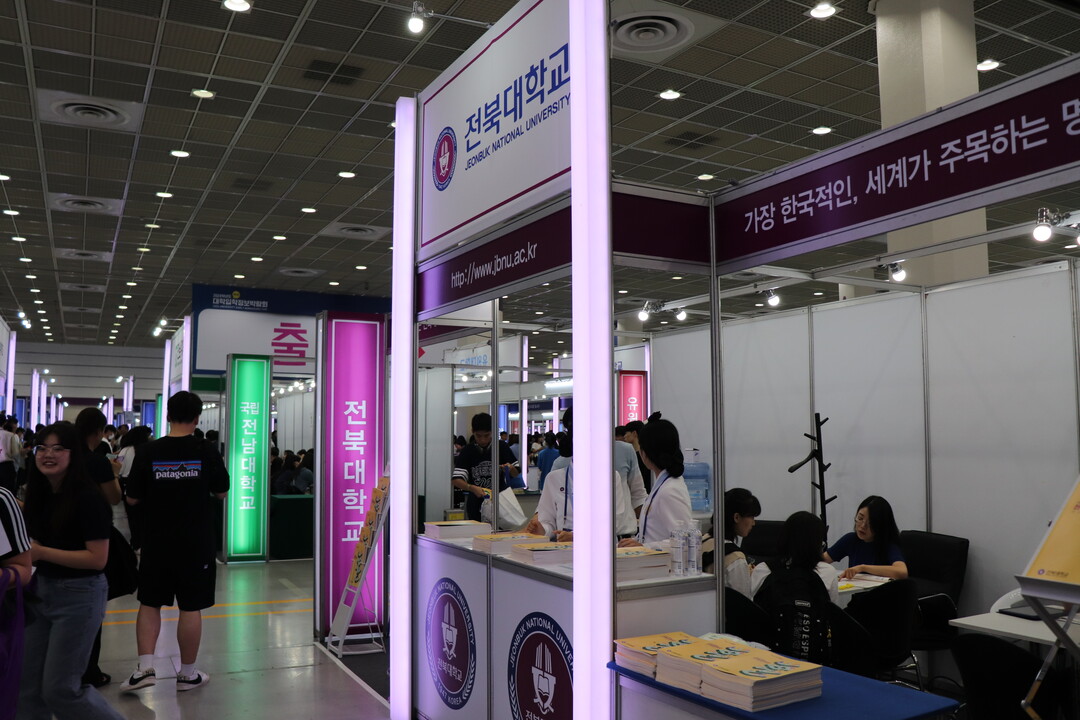 [대학저널 조영훈 기자]한국대학교육협의회가 주최하는 '2024학년도 수시 입학정보박람회'가 20일 서울 삼성동 코엑스에서 개막됐다. 오는 22일까지 열리는 수시박람회에는 전국 146개 대학이 참가하고 있다. 현재 수험생들이 대학부스에서 입시 상담을 진행하고 있다. 사진은 전북대학교 상담부스 모습.