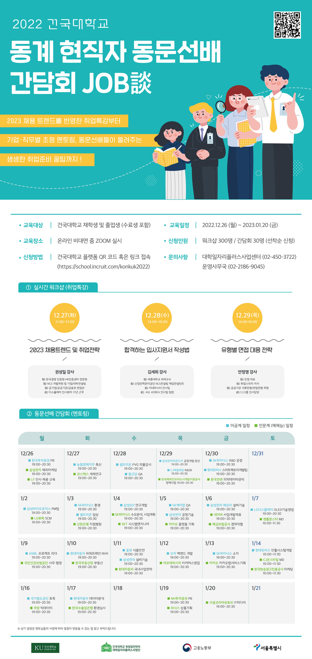 이번 동계에는 삼성전자와 SK하이닉스, 셀트리온, 현대자동차, 네이버, 국민건강보험 등 유명 기업에 재직 중인 50명의 건국대 동문이 참여 의사를 밝혔다.