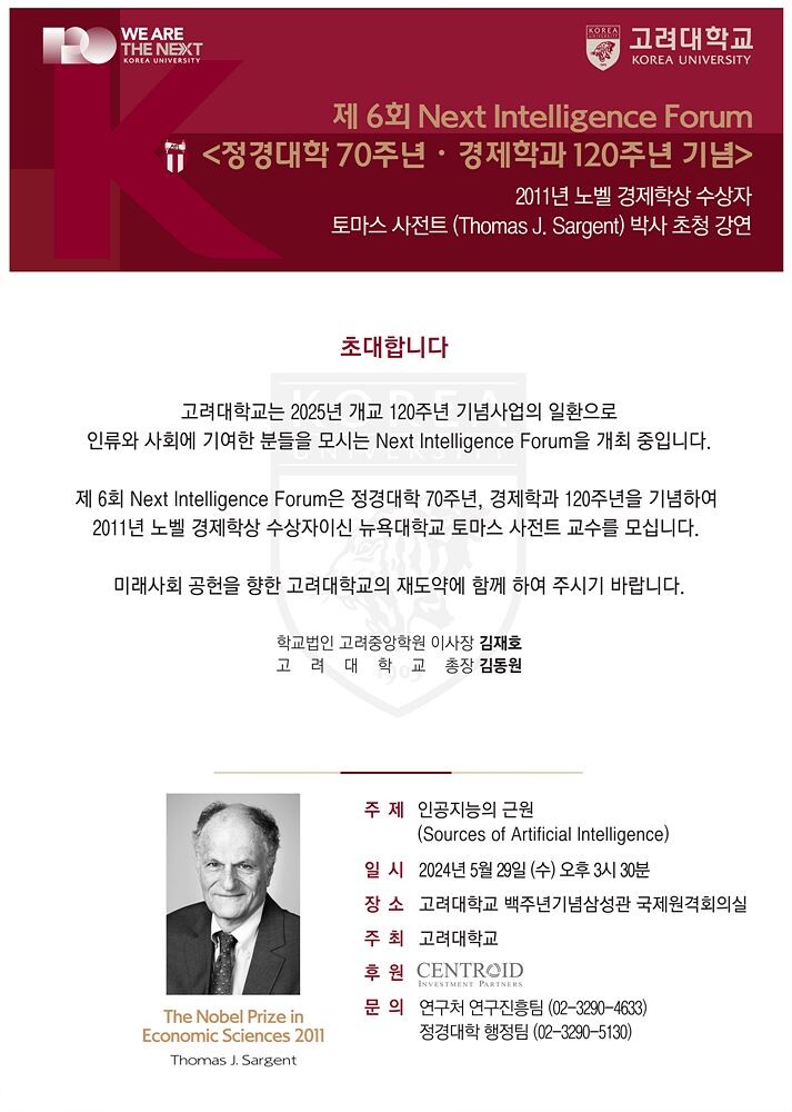 [대학저널 이선용 기자] 고려대학교는 5월 29일 오후 3시 30분 고려대 백주년기념삼성관 국제원격회의실에서 2011년 노벨 경제학상 수상자인 토마스 존 사전트(Thomas J. Sargent) 박사를 초청하여 ‘인공지능의 근원(Sources of Artificial Intelligence)’이라는 주제로 제6회 Next Intelligence Forum(이하 NIF)을 개최한다.
