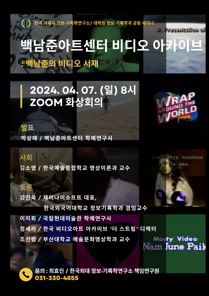 세미나를 준비한 노명환 한국외대 정보·기록학연구소장은 “백남준아트센터의 ‘백남준의 비디오 서재’ 사례를 통해 필름·비디오·디지털 파일 등 다양한 영상매체로 창작된 현대미술 작가들의 작품 아카이브 구축과 보존관리, 그리고 공적 활용에 대해 논의하는 자리가 되기를 바란다”고 밝혔다.