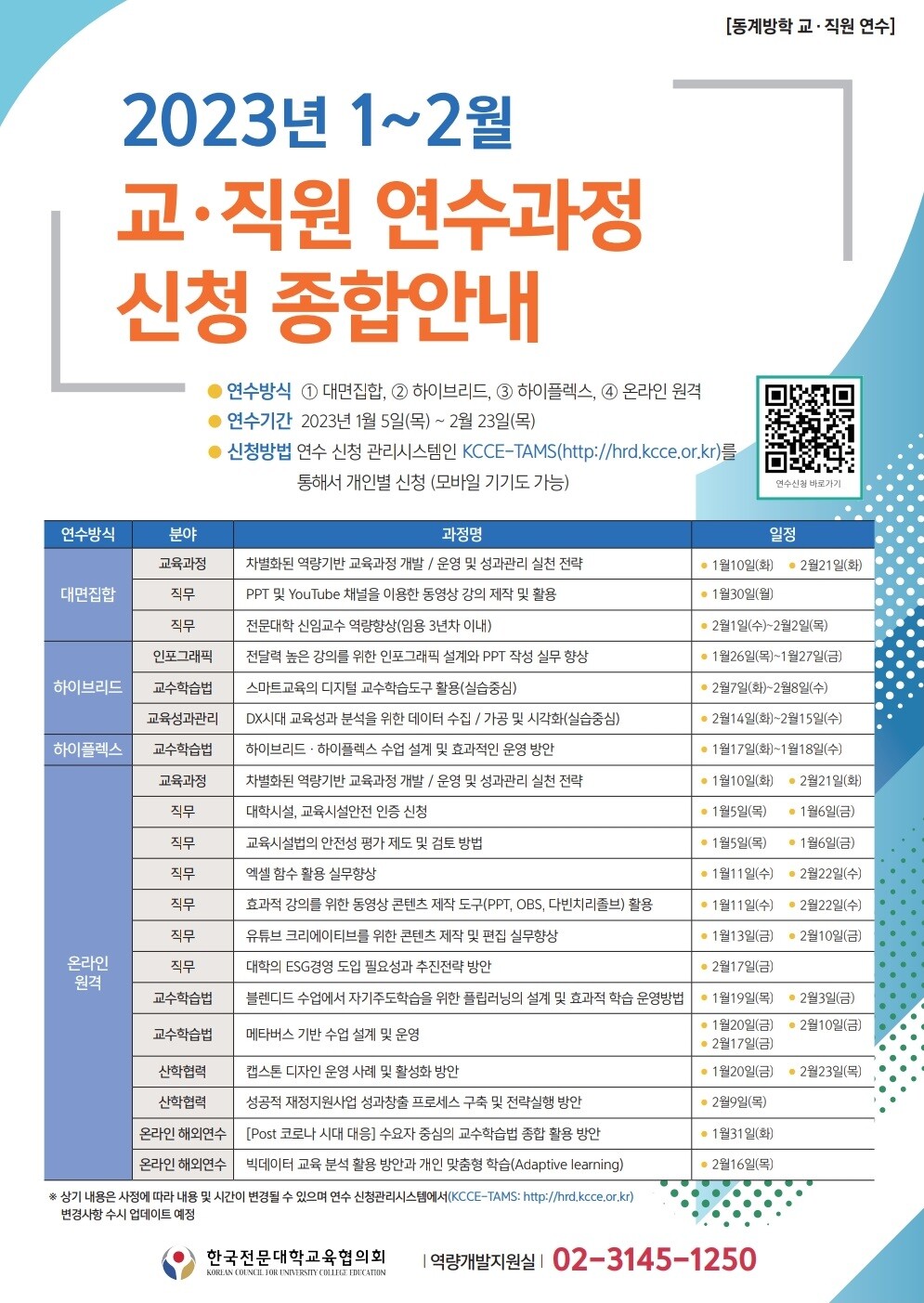 이번 집중 연수 기간 대학 교직원들의 수요 반영을 중심으로 교직원들에게 특화된 맞춤형 연수 과정을 다양한 방식으로 제공된다. 교직원에게 요구되는 교육과 직무역량을 지원하기 위해서다. ▲대면집합 연수방식(3개 과정) ▲하이브리드 연수방식(3개 과정) ▲하이플렉스 연수방식(1개 과정) ▲온라인 원격 연수방식(13개 과정) 등 총 4개 연수방식 20개 과정을 마련했다.