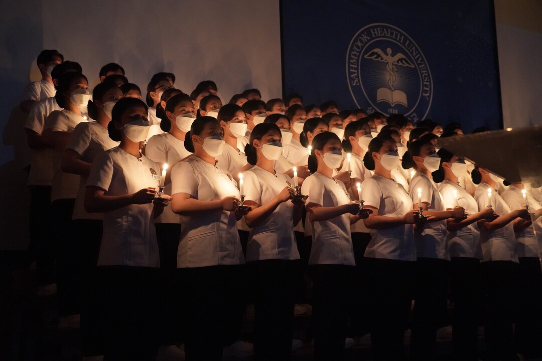 | 삼육보건대 간호학부의 2022학년도 제73회 나이팅게일선서식에서 학생들이 촛불을 들고 선서를 하고 있다. 사진=삼육보건대 제공 |