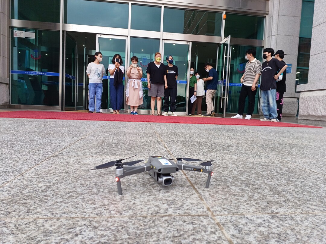 | 경동대의 '쇼핑몰 디지털큐레이터 양성과정'에 참여한 교육생들이 드론촬영 실습을 하고 있다. 사진=경동대 제공 |