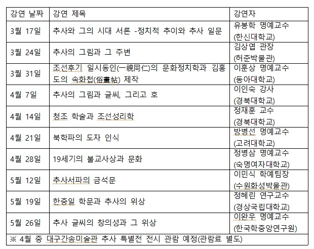 이번 프로그램은 강연 총 10회, 답사 1회로 진행되며, 3월 17일부터 5월 26일까지 매주 화요일 오후 4시 경북대 박물관 시청각실에서 열린다. 강연에서는 조선시대 미술의 거장인 추사 김정희의 생애와 사상, 작품 세계를 살펴보고 그가 활동했던 19세기의 숨겨진 역사를 소개한다.