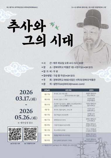 경북대 사학과와 박물관이 대구·경북 지역민과 함께하는 특별강연 ‘추사와 그의 시대’를 개최한다. 대구 라이즈(RISE) 사업의 일환으로 열리는 이번 강연은 한국을 대표하는 예술가와 그 시대를 심층적으로 다루기 위해 기획된 강연 시리즈의 상반기 프로그램이다. 하반기에는 ‘겸재와 진경시대’를 주제로 강연이 이어질 예정이다.
