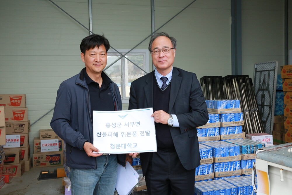 정윤(왼쪽) 청운대 총장이 지난 4일 충남 홍성군 서부면행정복지센터를 방문해 산불 현장에 필요한 긴급물품을 지원했다. 사진=청운대 제공 |