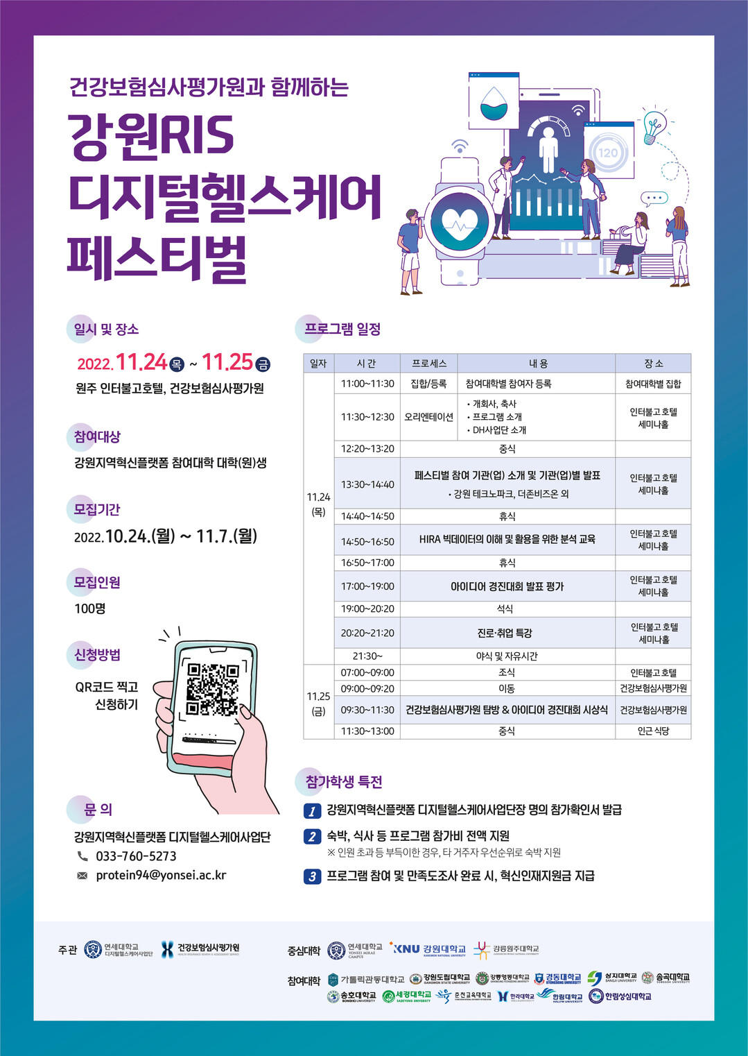 행사 첫날인 24일에는 강원도내 유관기관(업)의 디지털헬스케어 산업계 동향 파악 및 비전 제시와 관련한 세미나, 건강보험심사평가원 의료빅데이터 교육, 보건의료 빅데이터 아이디어 경진대회 발표평가, 진로·취업특강이 실시된다. 25일에는 건강보험심사평가원 빅데이터실 견학과 아이디어 경진대회 시상식이 열린다.