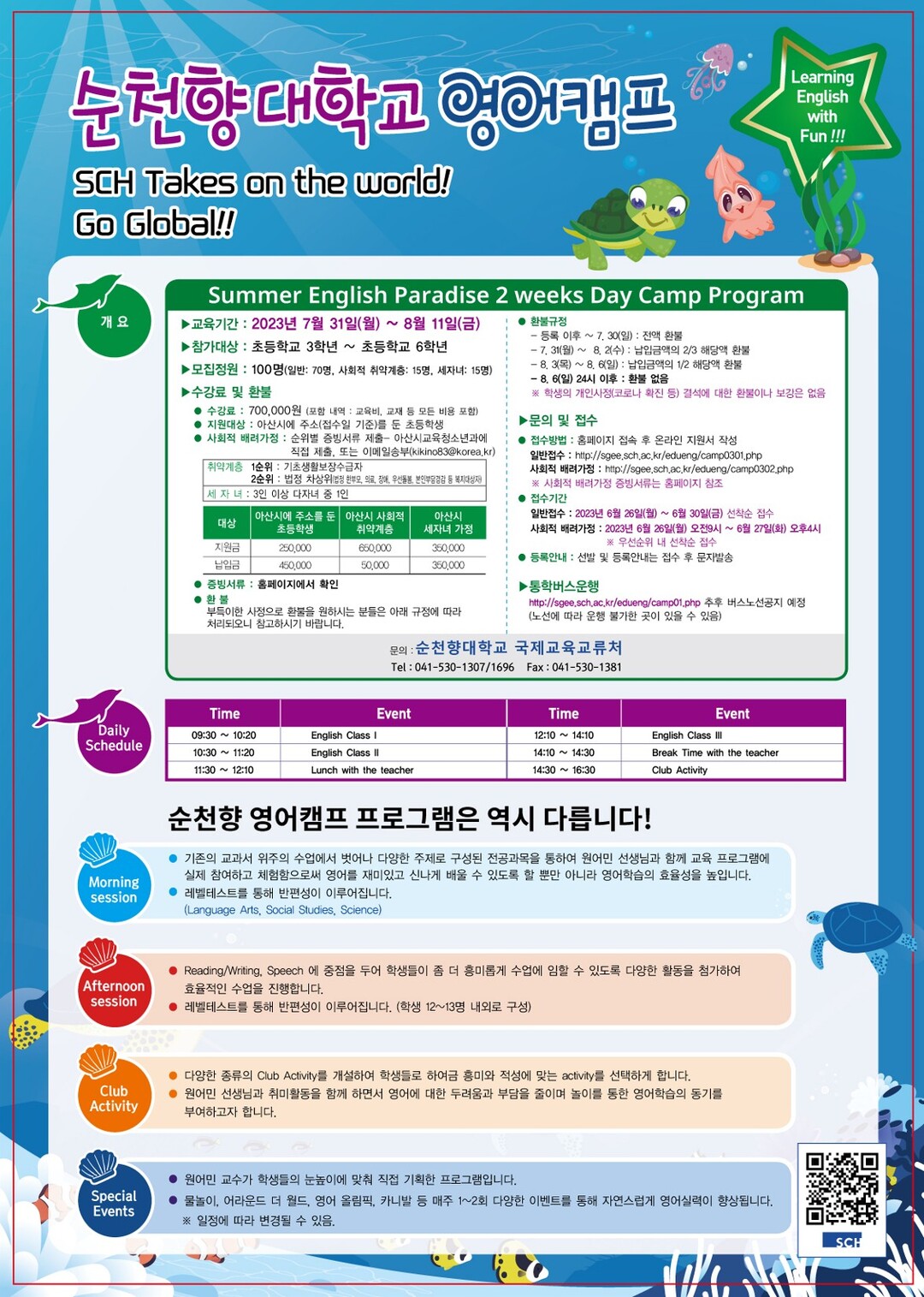 이번 캠프는 아산시의 지원으로 순천향대 소속 원어민 교수진 30명이 지역 소재 초등학생 3~6학년 중 일반 학생 70명과 사회적 취약계층 학생 15명, 3인 이상 다자녀 가정 학생 15명 등 100명을 대상으로 주 5일 2주간 실습 중심의 영어교육을 한다.