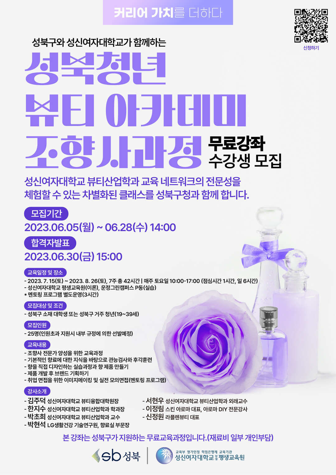 참가 신청은 오는 28일까지이며, 성신여대 평생교육원 블로그에서 신청할 수 있다. 수료자에게는 성북구청장과 성신여대 총장 명의의 수료증도 함께 발급한다.