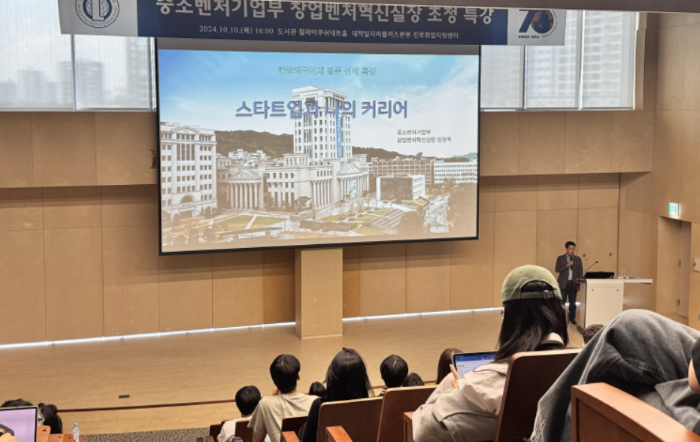 한국외대 대학일자리플러스본부가 10일 임정욱 중소벤처기업부 창업벤처혁신실장을 초청하여 ‘2024 동문 선배 특강’을 개최했다. 사진=한국외대 제공 |