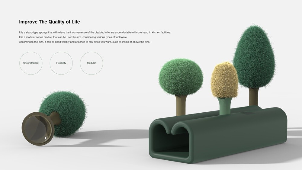 2023 iF디자인어워드 첫 번째 수상작인 Woody는 한 손이 불편한 지체장애인이 두 손을 써야 하는 설거지를 할 수 없다는 점에 착안해 한 손으로도 설거지를 할 수 있도록 고안된 제품이다.