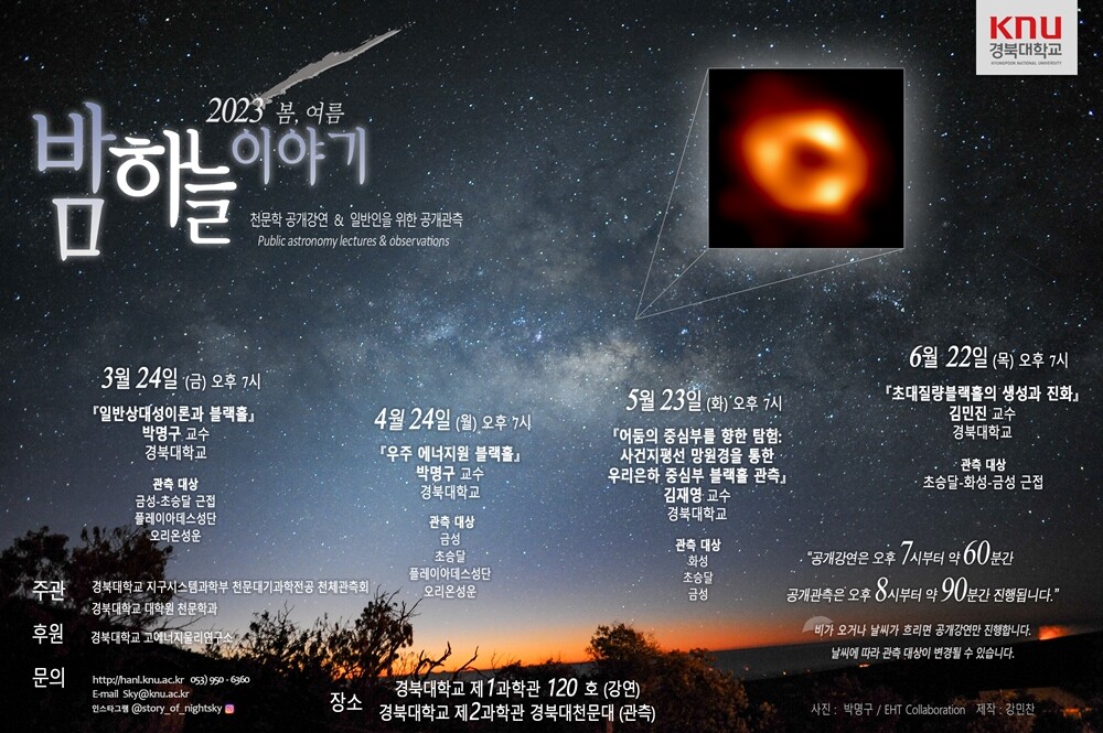 경북대가 ‘2023 봄, 여름 밤하늘 이야기’를 이달 24일과 4월 24일, 5월 23일, 그리고 6월 22일 대구캠퍼스에서 개최한다. |