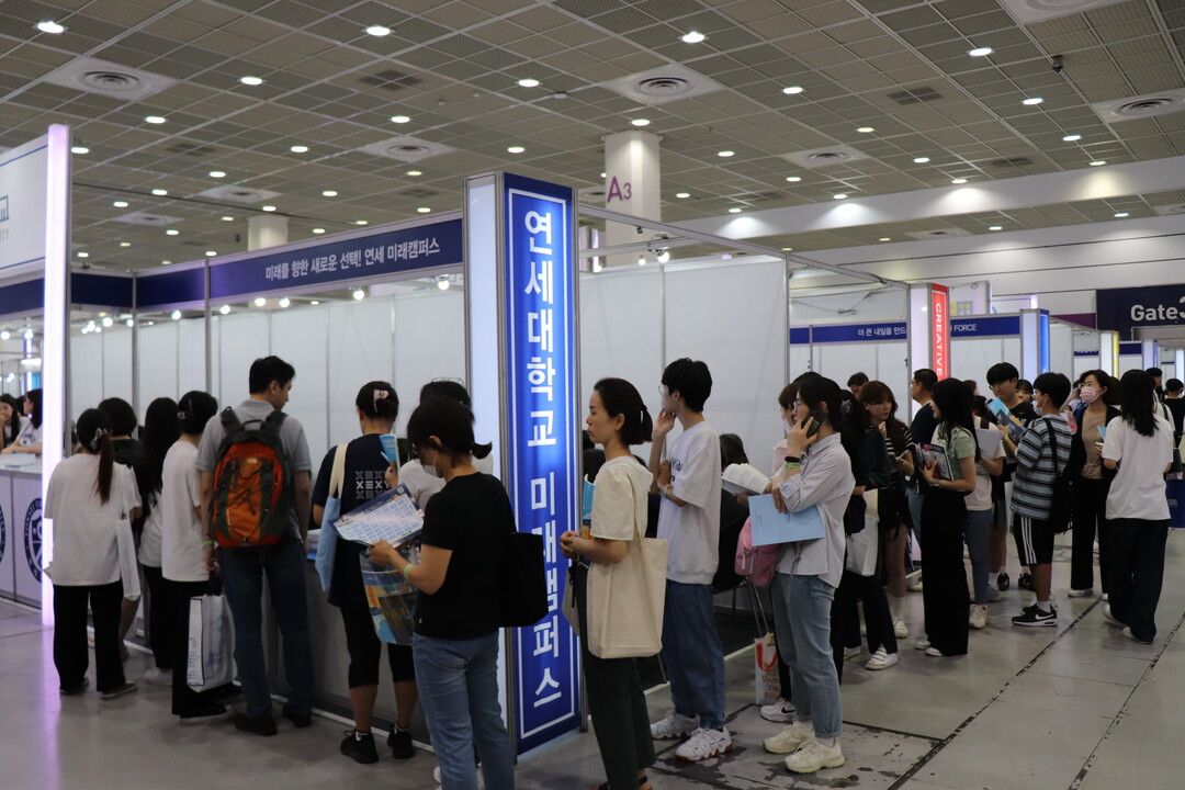 [대학저널 조영훈 기자]한국대학교육협의회가 주최하는 '2024학년도 수시 입학정보박람회'가 20일 서울 삼성동 코엑스에서 개막됐다. 오는 22일까지 열리는 수시박람회에는 전국 146개 대학이 참가하고 있다. 현재 수험생들이 대학부스에서 입시 상담을 진행하고 있다. 사진은 연세대학교 미래캠퍼스 상담부스 모습.