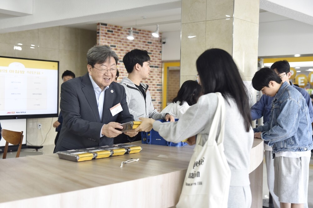 이남식 재능대 총장은 23일 제물포캠퍼스 자율관 1층 라운지에서 김밥, 바나나, 건강음료 등의 아침밥을 배식하며 학생들에게 응원의 말을 전했다.