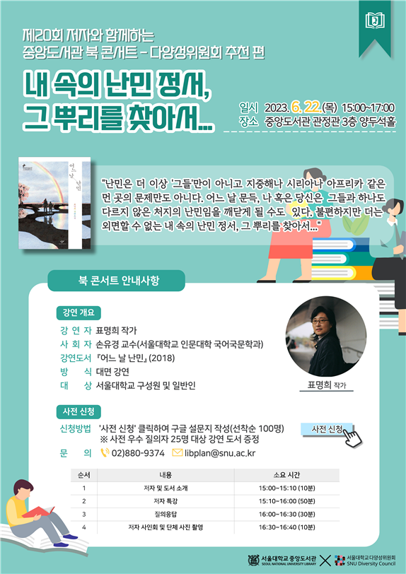 저자와 함께하는 중앙도서관 북 콘서트 – 다양성위원회 추천 편 행사는 지난 5월 세계 문화다양성의 날(5월 21일)을 기념해 개최한 ‘다양성 도서/영화 추천사 공모전’에서 당선된 도서 30선 중 최우수 추천사로 선정된 ‘어느 날, 난민’을 대상으로 열린다.