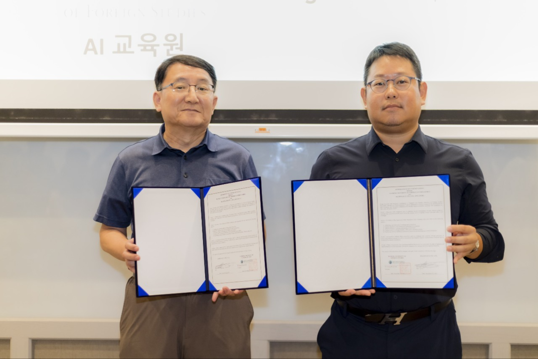 | 김낙현(왼쪽)한국외대 AI교육원장과 정기욱 디지파이낸스 대표가 업무협약을 체결한 뒤 협약서를 펼쳐보이고 있다. 사진=한국외대 제공 |