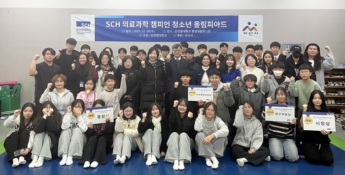 12월 31일 순천향대 향설생활관에서 열린 SCH의료과학 챔피언 청소년 올림피아드 행사 종료 후 참가자들이 기념촬영을 하고 있다. 사진=순천행대 제공 |