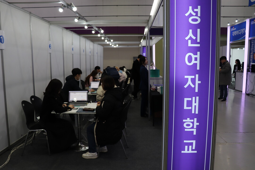 사진은 성신여자대학교 부스에서 입시 상담을 받고 있고 있는 수험생들의 모습이다.