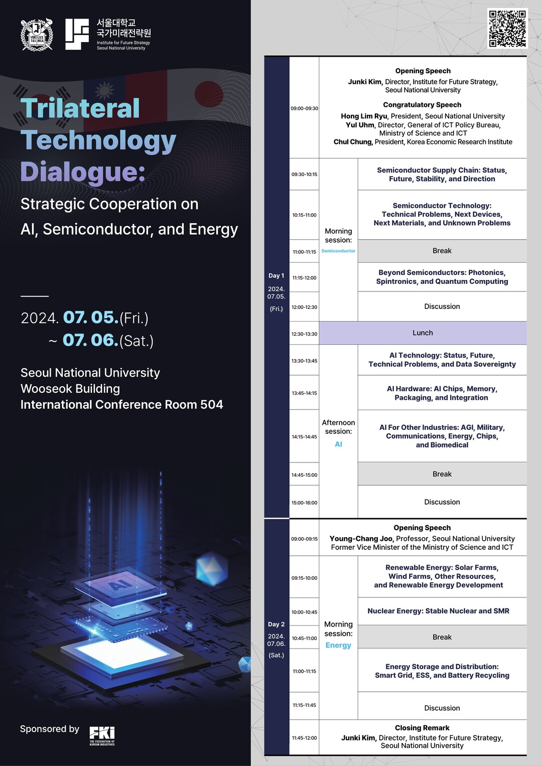 또 반도체 대화는 과학기술·민주주의·사회연구센터(DSET) 원장인 Wen-ling Tu가, AI 대화는 서울대 정치외교학부 박종희 교수가, 그리고 에너지 대화는 도쿄대 Hideaki Shiroyama 교수가 좌장을 맡았고, 분야별 대화 후 토론으로 이어진다.
