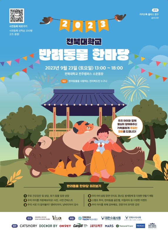 전북대 수의과대학 학생회가 주최하고, 국립대학육성사업과 대한수의사회, 전북수의사회 등이 후원하는 이번 행사는 23일 오후 1시부터 전북대 전주캠퍼스 소운동장에서 반려동물과 관련한 체험 부스와 강연 등 다채로운 행사로 열린다.