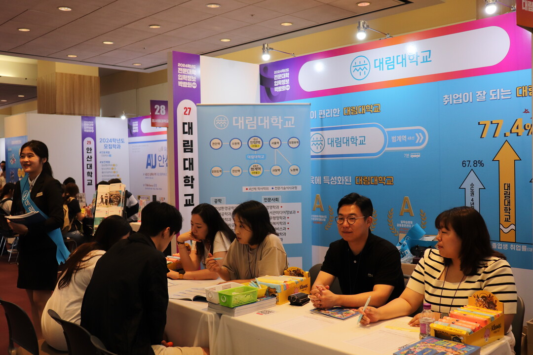 [대학저널 조영훈 기자]유웨이 어플라이가 주최하는 '2024학년도 전문대학 입학정보박람회'가 20일 서울 삼성동 코엑스에서 개막됐다. 오는 21일 오후 5시까지 열리는 박람회에는 전국 28개 전문대학이 참가하고 있다. 현재 수험생들이 대학부스에서 입시 상담을 진행하고 있다. 사진은 대림대학교 상담부스 모습.