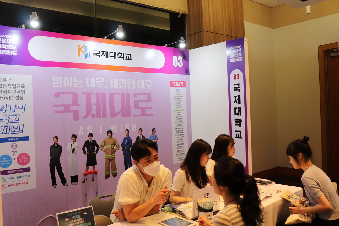 [대학저널 조영훈 기자]유웨이 어플라이가 주최하는 '2024학년도 전문대학 입학정보박람회'가 20일 서울 삼성동 코엑스에서 개막됐다. 오는 21일 오후 5시까지 열리는 박람회에는 전국 28개 전문대학이 참가하고 있다. 현재 수험생들이 대학부스에서 입시 상담을 진행하고 있다. 사진은 국제대학교 상담부스 모습.