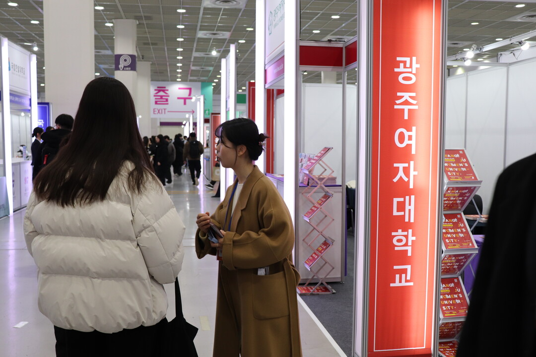 사진은 광주여자대학교 부스에서 박람회 참석자가 관계자에게 입시 상담을 문의하고 있다.