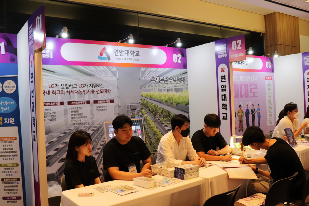[대학저널 조영훈 기자] 유웨이 어플라이가 주최하는 '2024학년도 전문대학 입학정보박람회'가 20일 서울 삼성동 코엑스에서 개막됐다. 오는 21일 오후 5시까지 열리는 박람회에는 전국 28개 전문대학이 참가하고 있다. 현재 수험생들이 대학부스에서 입시 상담을 진행하고 있다. 사진은 연암대학교 상담부스 모습.