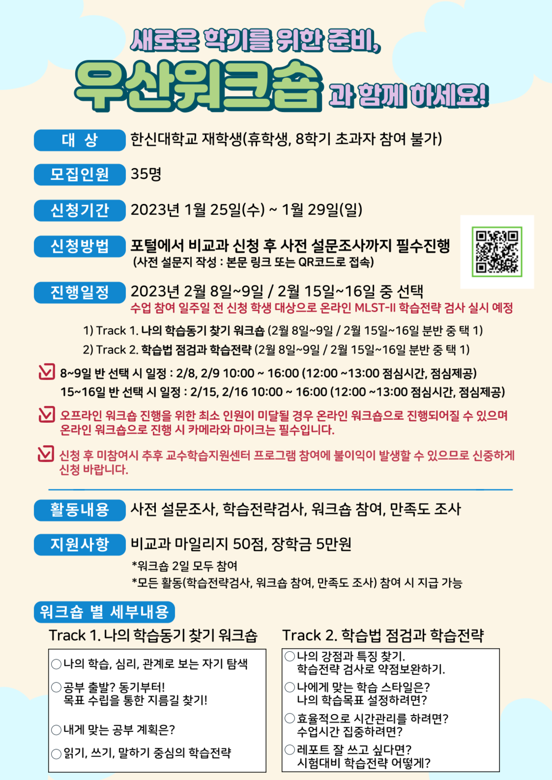 대학혁신지원사업의 일환으로 진행되는 프로그램으로 워크숍 수료자에게는 비교과 마일리지 50점과 장학금 5만 원이 지급된다.