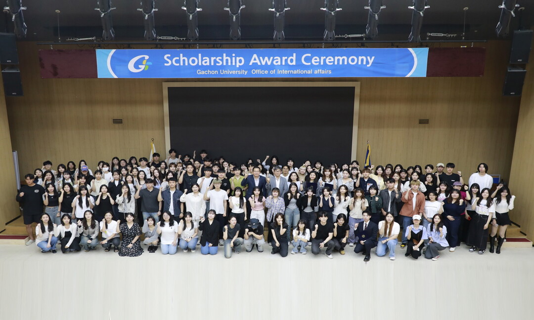 가천대가 해외파견에 앞서 지난 7일 대학 가천관 계단강의실에서 장학증 수여식을 개최하고 학생들에게 장학증서를 수여했다. 사진=가천대 제공 |