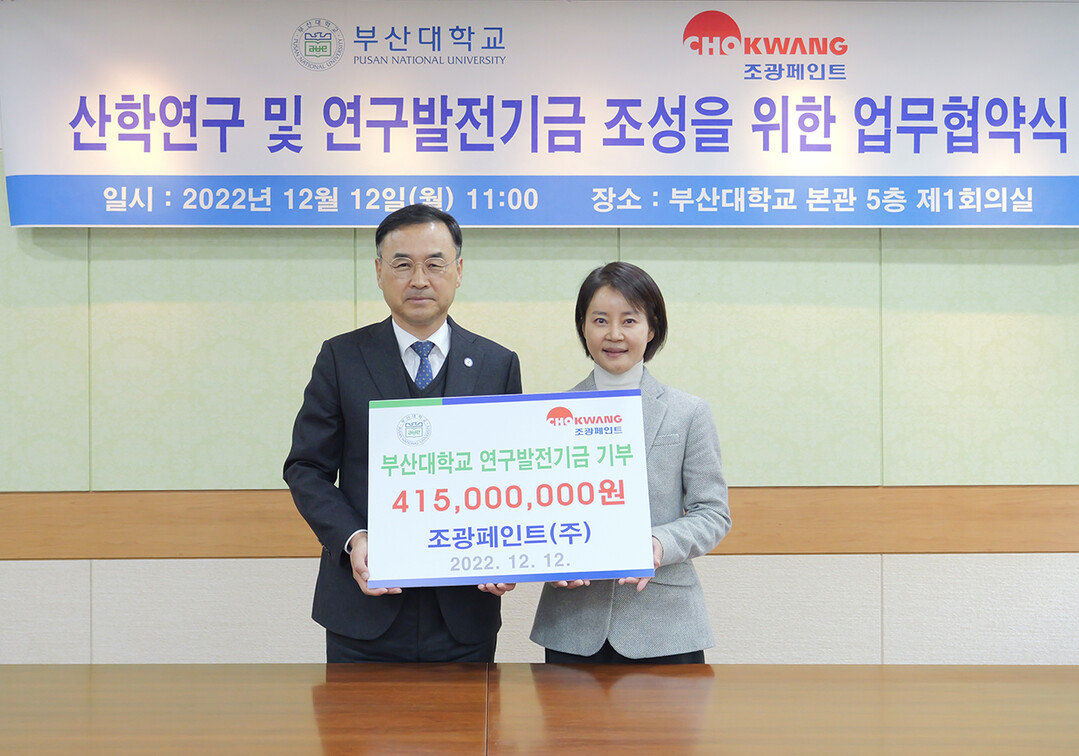 [대학저널 온종림 기자]부산대학교는 12일 조광페인트㈜와 고분자공학 분야 첨단기술 개발 및 우수인재 육성을 위한 산학협력연구 및 연구발전기금 조성에 관한 협약을 체결했다. 이날 조광페인트㈜는 부산대에 연구발전기금 4억 1,500만 원을 출연했다.