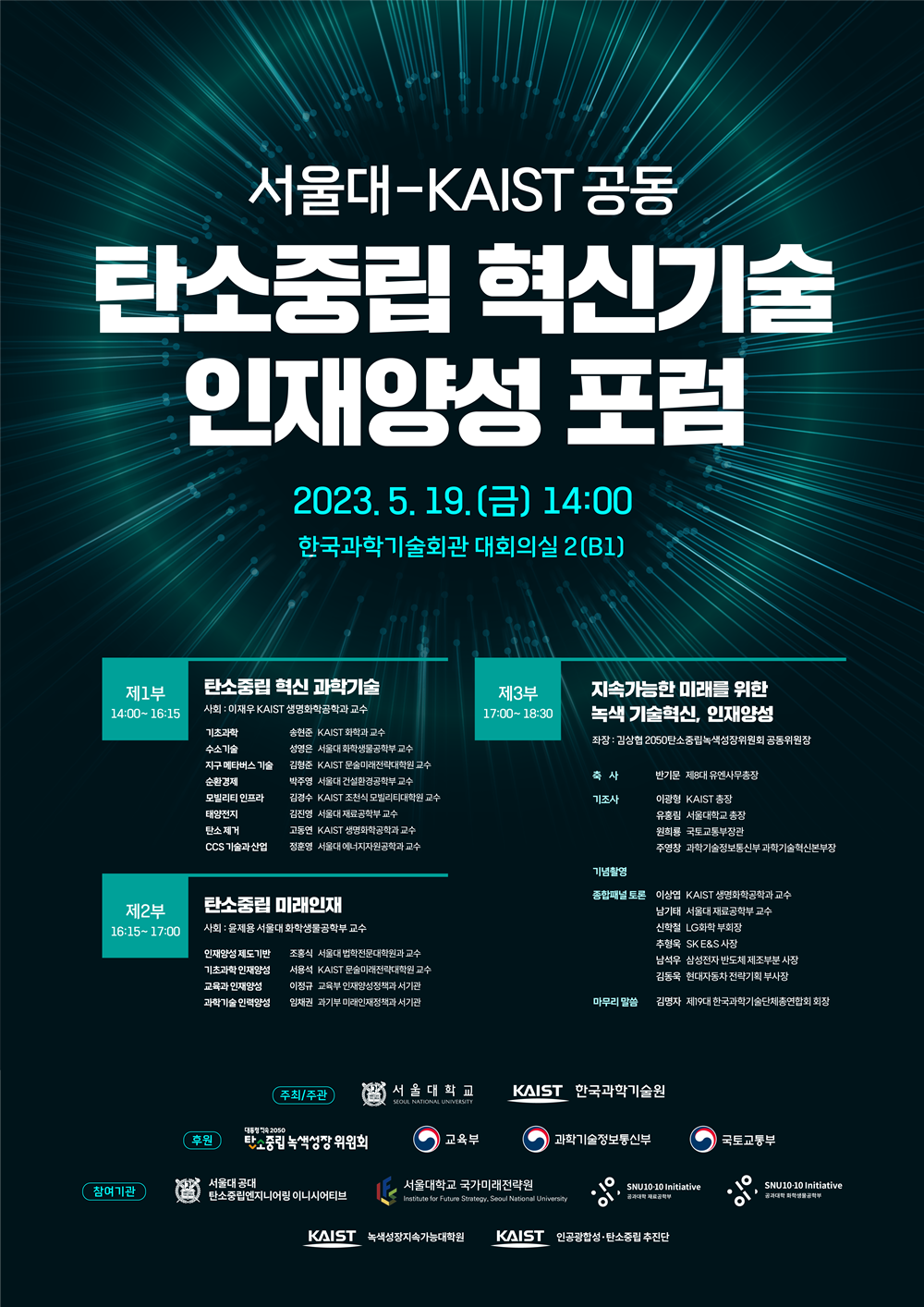 공동 포럼의 1부는 이재우 KAIST 교수의 사회로 ‘탄소중립 혁신과학기술’을 주제로 진행되고 , 2부는 윤제용 서울대 교수의 진행으로 ‘탄소중립 미래인재’에 대해 논의한다.