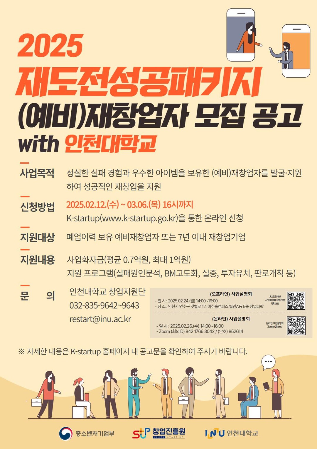 사업설명회에서는 재도전성공패키지 신청 및 접수 관련 설명회, 인천대학교 주요 프로그램 및 인프라 지원사항 소개, 1:1 상담 지원 계획도 있으며, 자세한 내용은 인천대 창업지원단 홈페이지에서 확인할 수 있다.