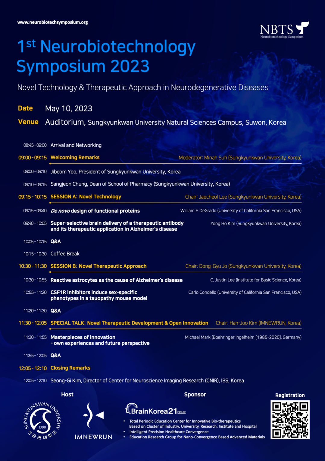 신규 기술(Novel Technology), 신 치료 접근법(Novel Therapeutic Approach), 신규 치료제 개발 및 오픈 이노베이션(Novel Therapeutic Development & Open Innovation)으로 2개의 세션과 스페셜 강연으로 나눠 진행한다.