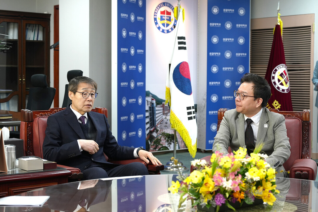 왼쪽부터 성결대 정희석 총장과 AC 호텔 바이 메리어트 서울 금정 이휘영 총지배인이 산학협력 협정 체결에 앞서 협력 방안에 대해 대화를 나누고 있다. 사진=성결대 제공 |